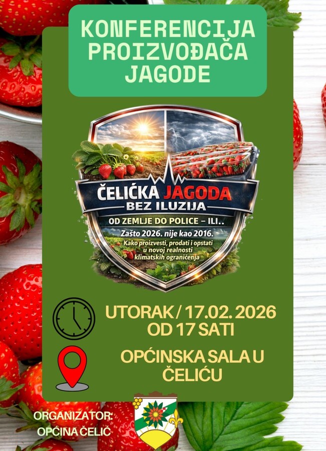 Općina Čelić poziva sve zainteresovane na IV. konferenciju proizvođača jagode "Čelić 2026", koja će se održati 17. februara 2026. godine u Sali Općinskog vijeća Čelić sa početkom u 17:00 sati.